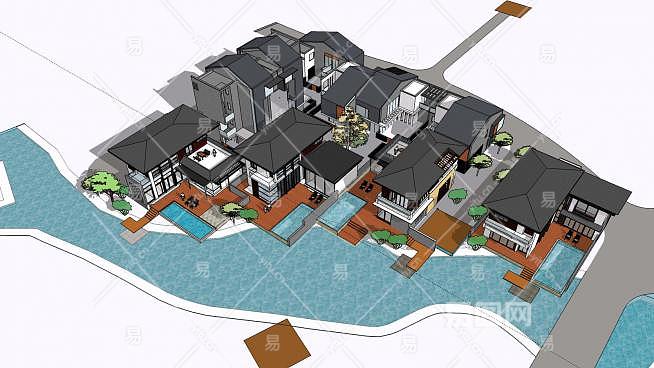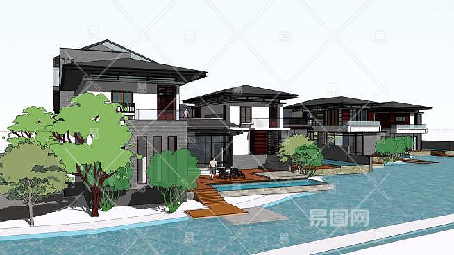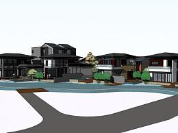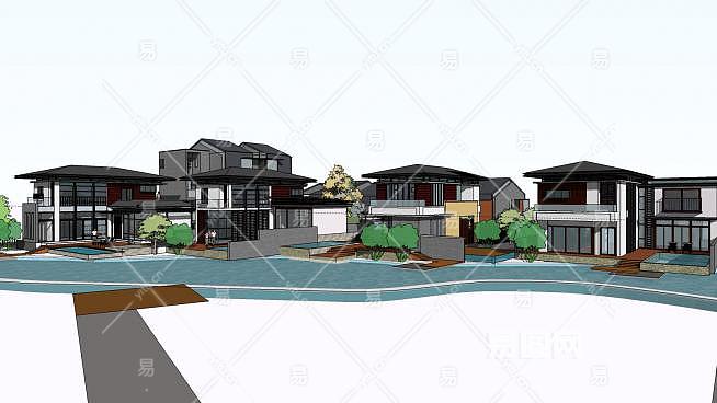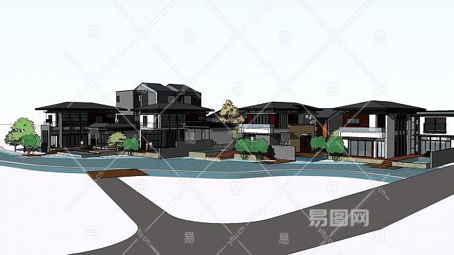 现代中式联排别墅群SU模型下载_sketchup草图大师SKP模型