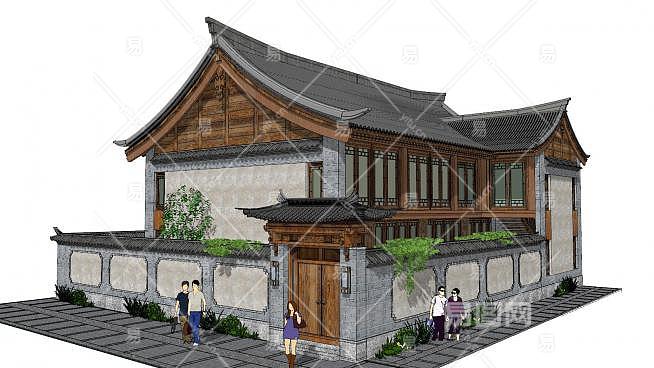 中式悬山顶别墅建筑SU模型下载_sketchup草图大师SKP模型