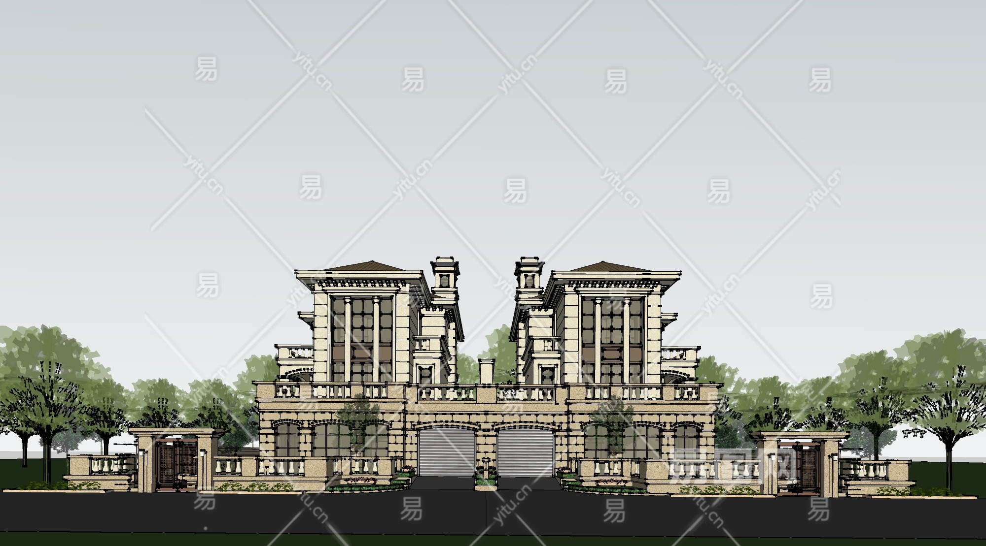 简欧双别墅 ,景观庭院,院墙围墙,大门门头 su草图模型下载
