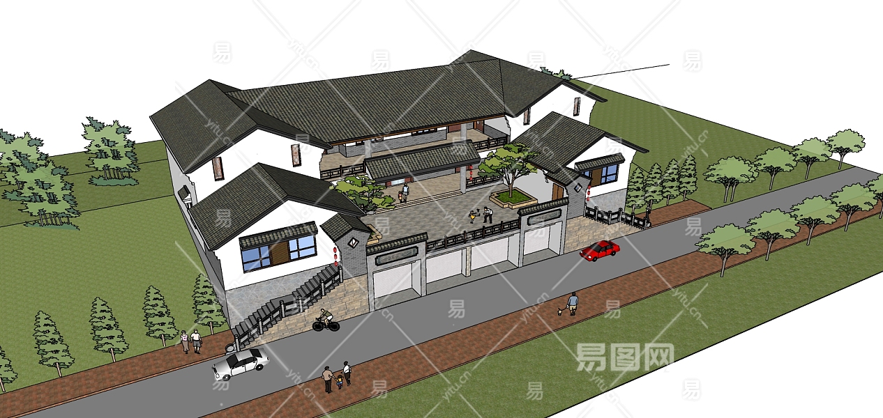 96新中式乡村四合院 中式四合院建筑 花园景观 乡村民宿 民宅 新中式农家乐院子su草图模型下载