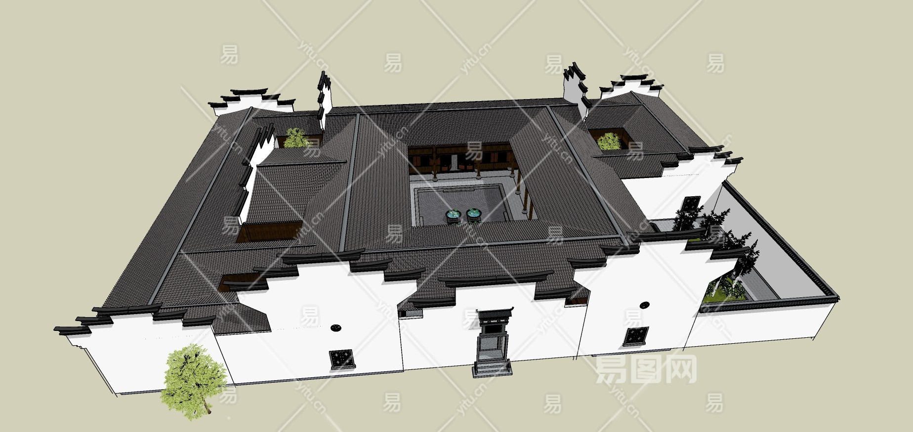 80徽派古建四合院 马头墙,院墙 大门 门头 徽派新中式四合院,徽派庭院景观su草图模型下载