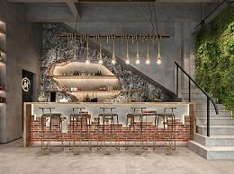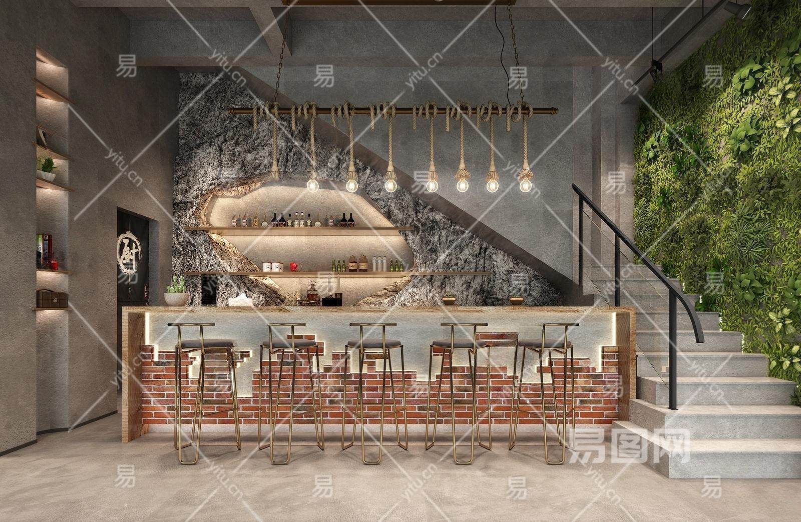 工业风咖啡厅操作台 破损墙体 绿植墙体 吊灯 楼梯 吧台凳