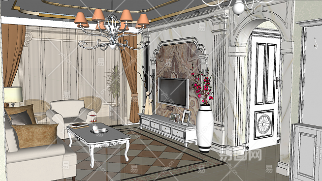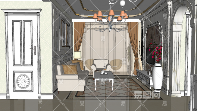 欧式风格客厅大户型SU模型下载_sketchup草图大师SKP模型