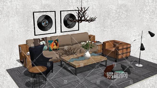 工业复古风客厅软装SU模型下载_sketchup草图大师SKP模型