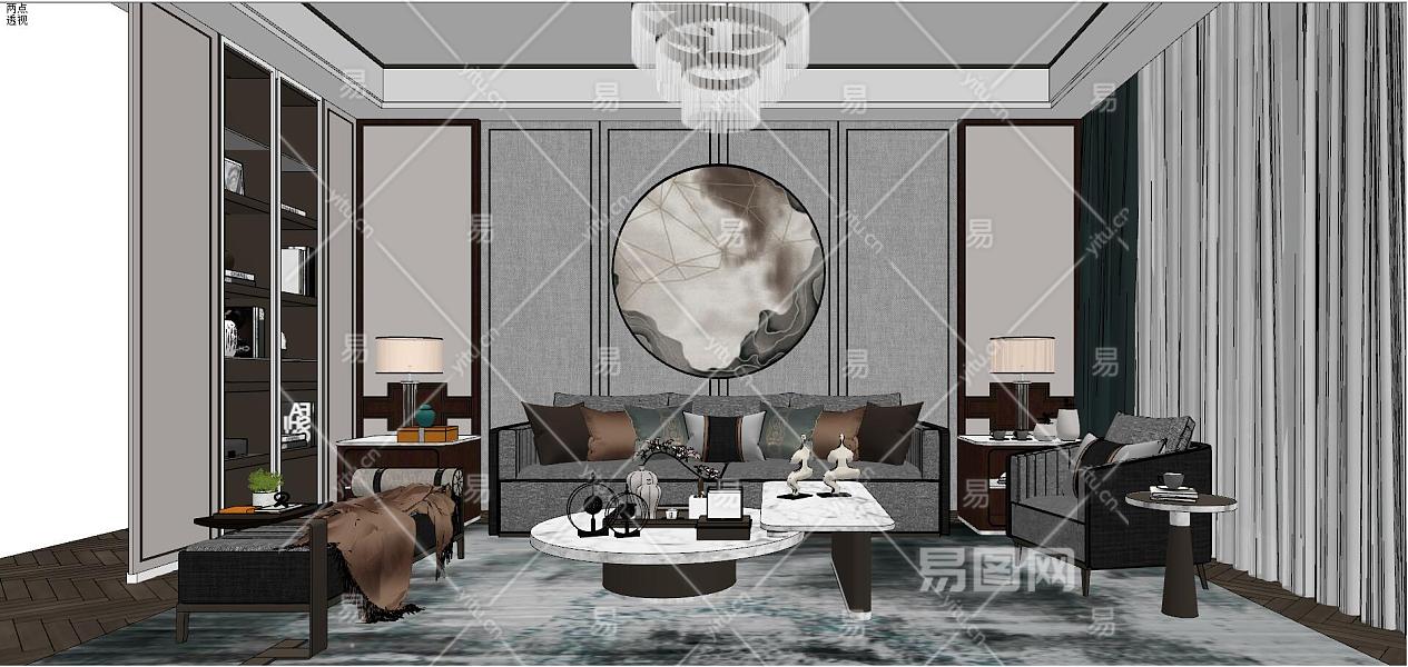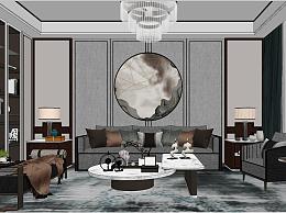 081新中式后现代港式轻奢新古典客厅su草图模型下载