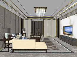 新中式客厅家具沙发吸顶灯su草图模型下载