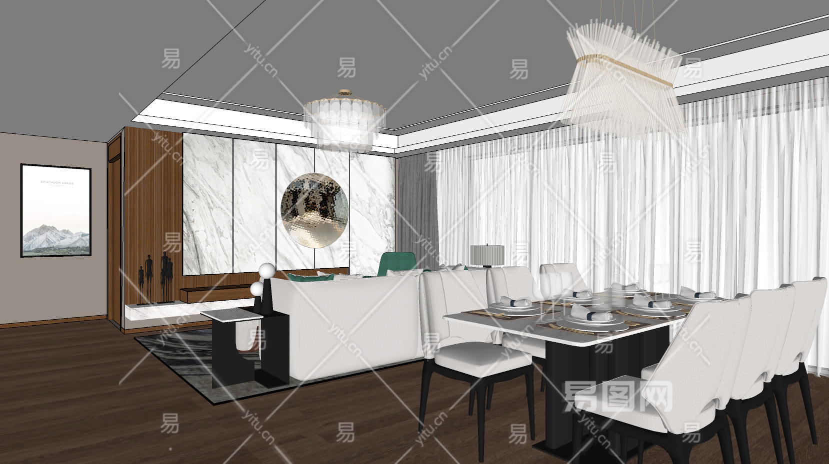 壹思设计 现代客餐厅,餐桌椅 su草图模型下载