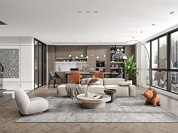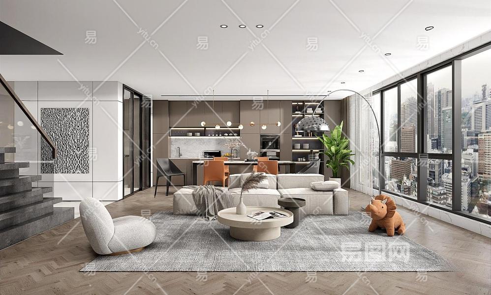 现代客餐厅 沙发茶几 餐桌椅 西橱柜 吊灯 雕塑摆件 楼梯 植物