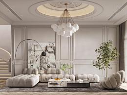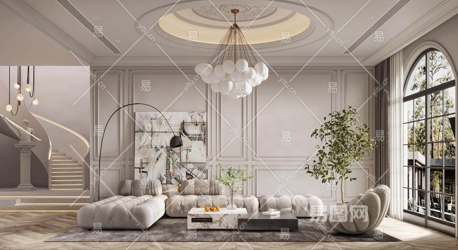 法式客厅 沙发组合 单人沙发 落地灯 装饰画 吊灯 植物 旋转楼梯 茶几