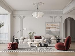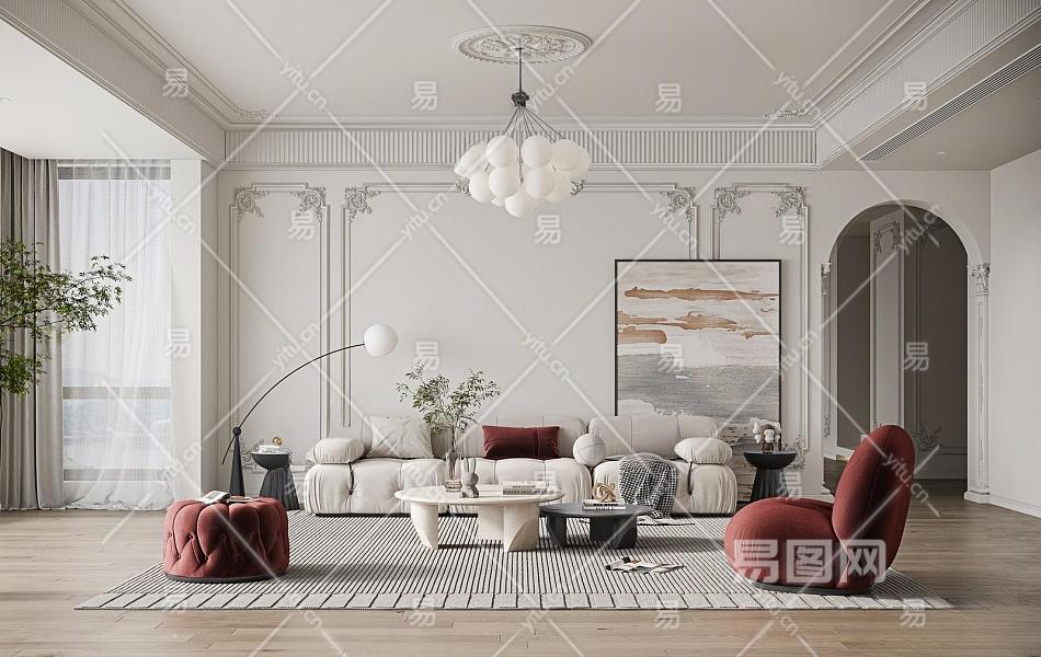 法式客厅 沙发茶几组合 单人休闲椅 绿植 饰品摆件