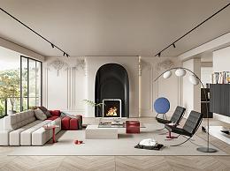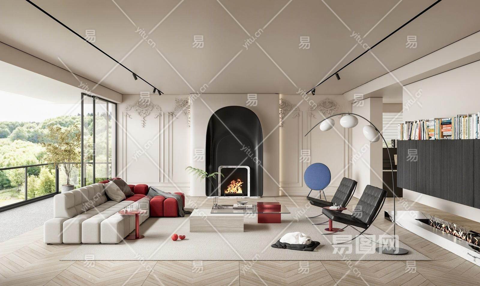 法式客厅 沙发茶几组合 壁炉 休闲椅 落地灯 书柜