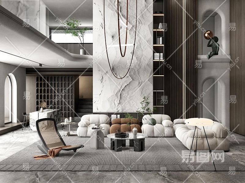 现代客厅 沙发茶几组合 躺椅 雕塑摆件 毛石蘑菇石