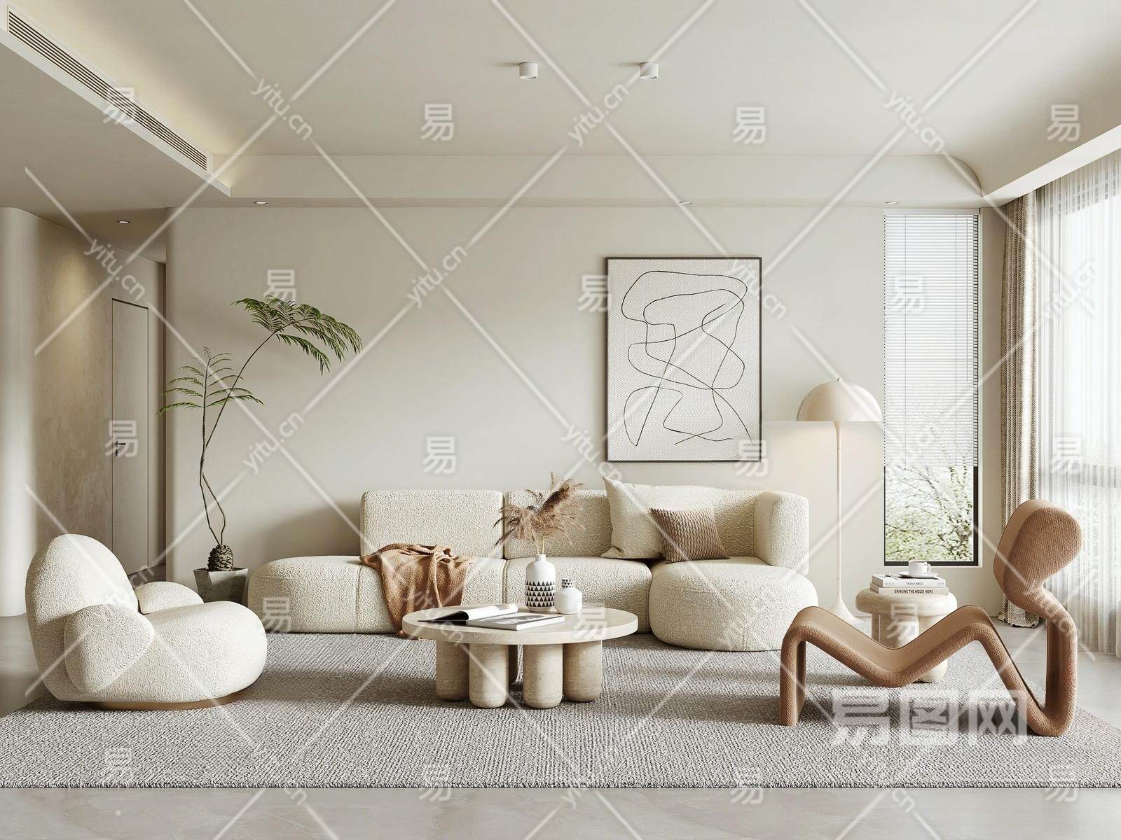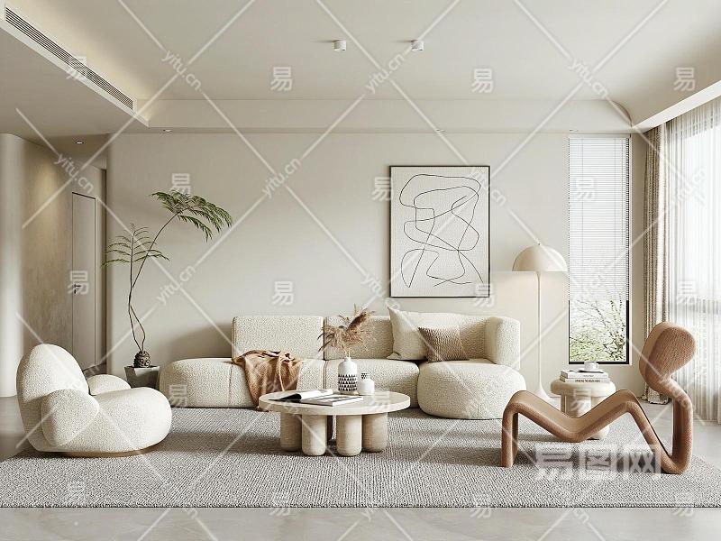 侘寂奶油风客厅 羊羔绒沙发 单人沙发 躺椅 茶几 落地灯 边几 绿植
