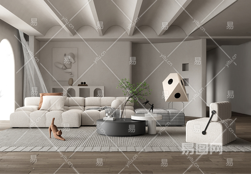 侘寂风客厅 沙发茶几组合 落地灯 雕塑摆件 墙饰挂件 单人沙发