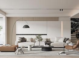 现代别墅客厅 多人沙发 休闲椅 植物 落地灯 楼梯间