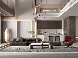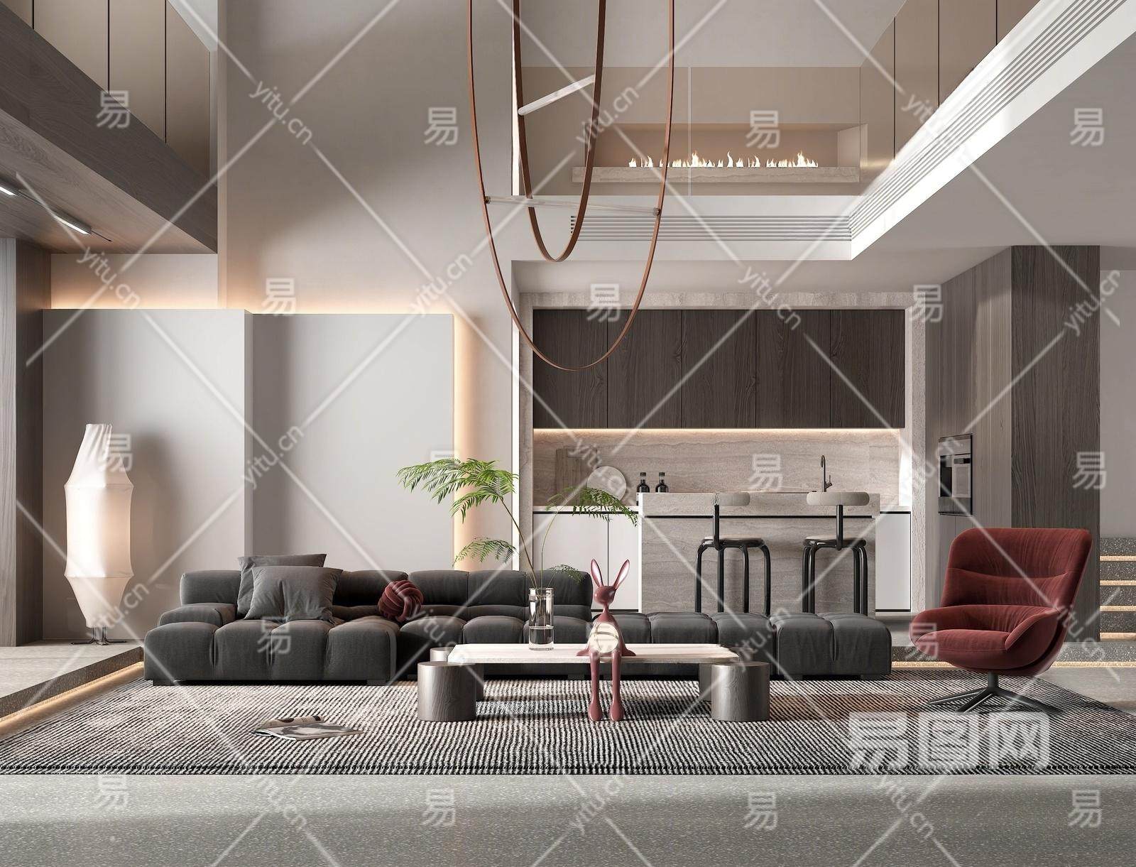 现代别墅客厅 布艺多人沙发 单人沙发 茶几 开放式厨房 吊灯 吧椅 吧台