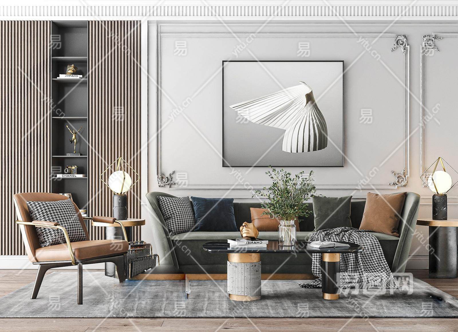 简欧客厅 沙发茶几组合 多人沙发 沙发背景墙 休闲椅 台灯 挂画