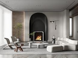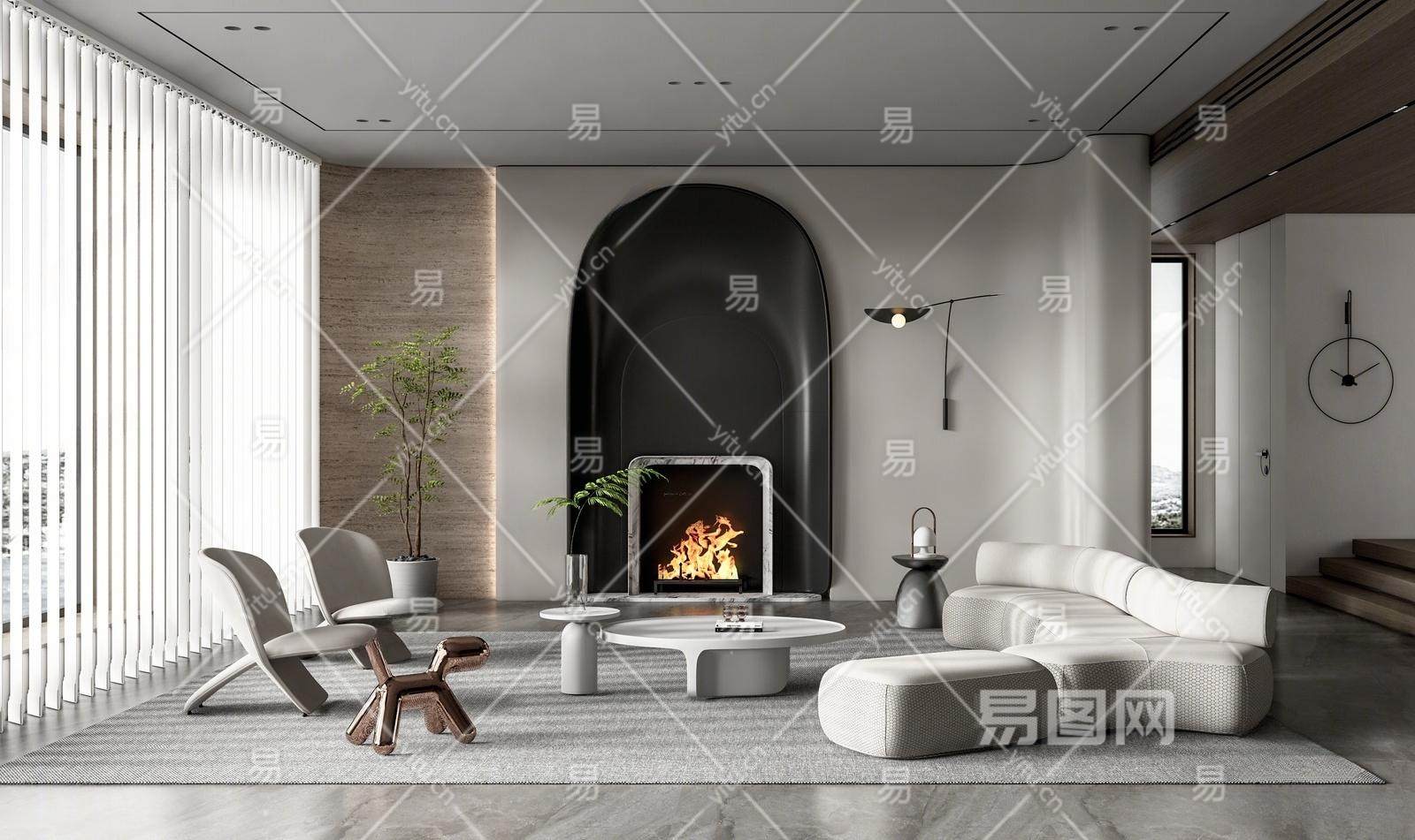 现代别墅客厅 沙发茶几组合 壁炉 壁灯 梦幻帘
