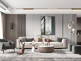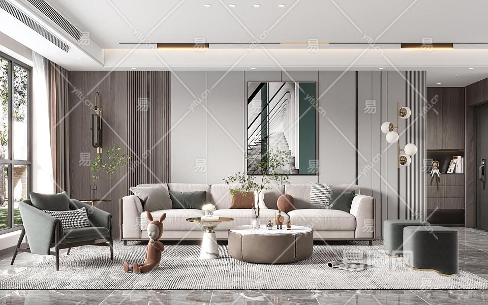 现代家居客厅 客厅 沙发 休闲椅 茶几 吊灯 摆件 雕塑 饰品 百叶帘