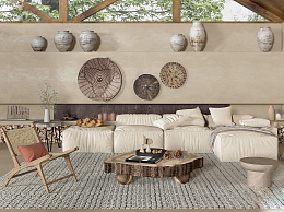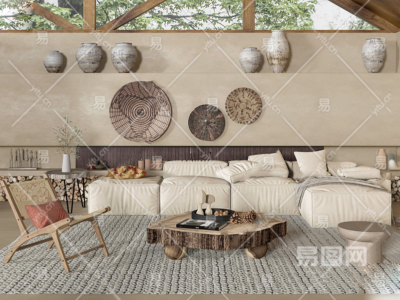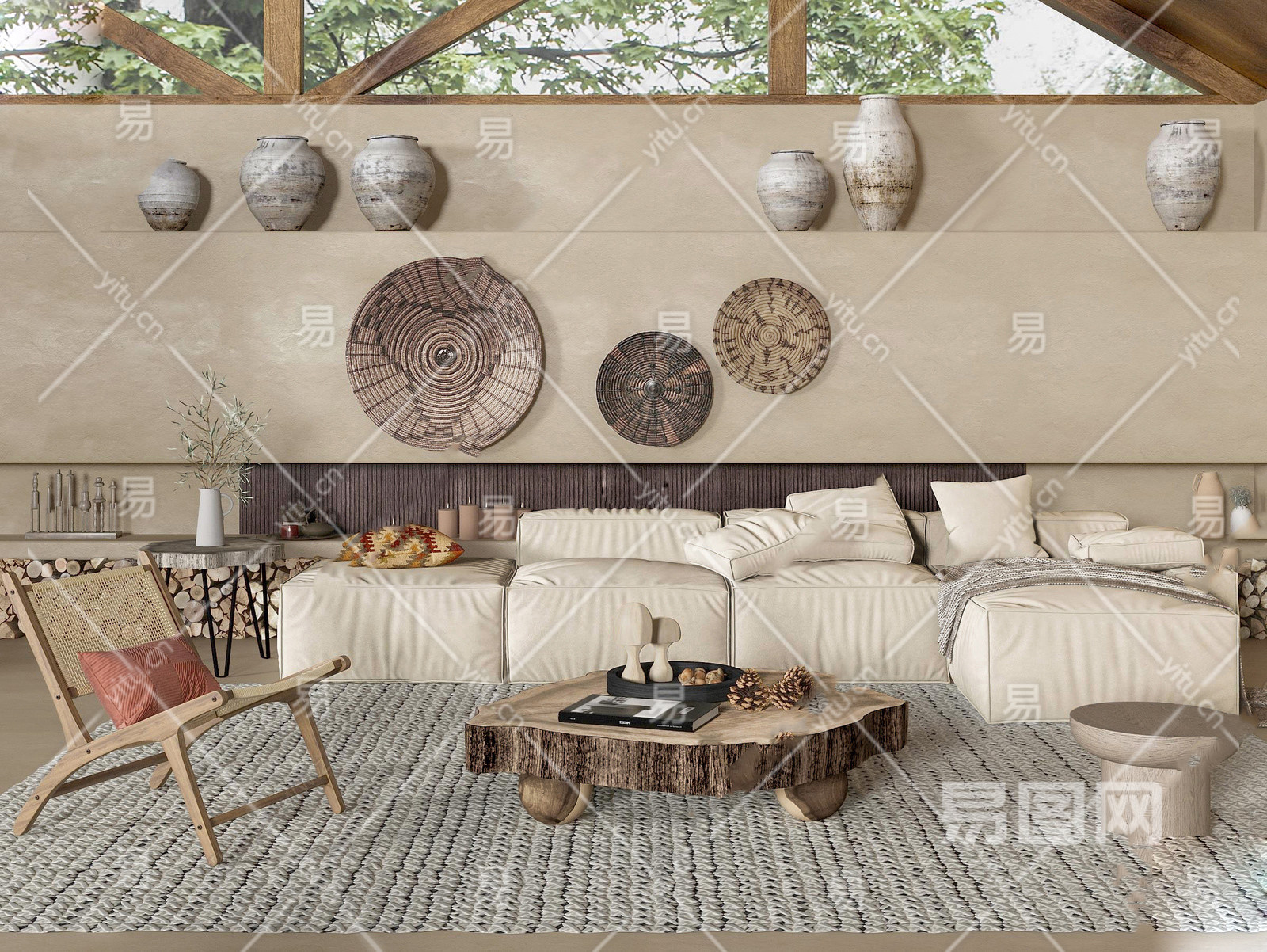 现代诧寂客厅 沙发茶几组合 休闲椅 圆凳 边几 柴火 墙饰 陶罐