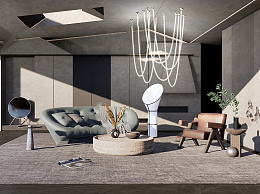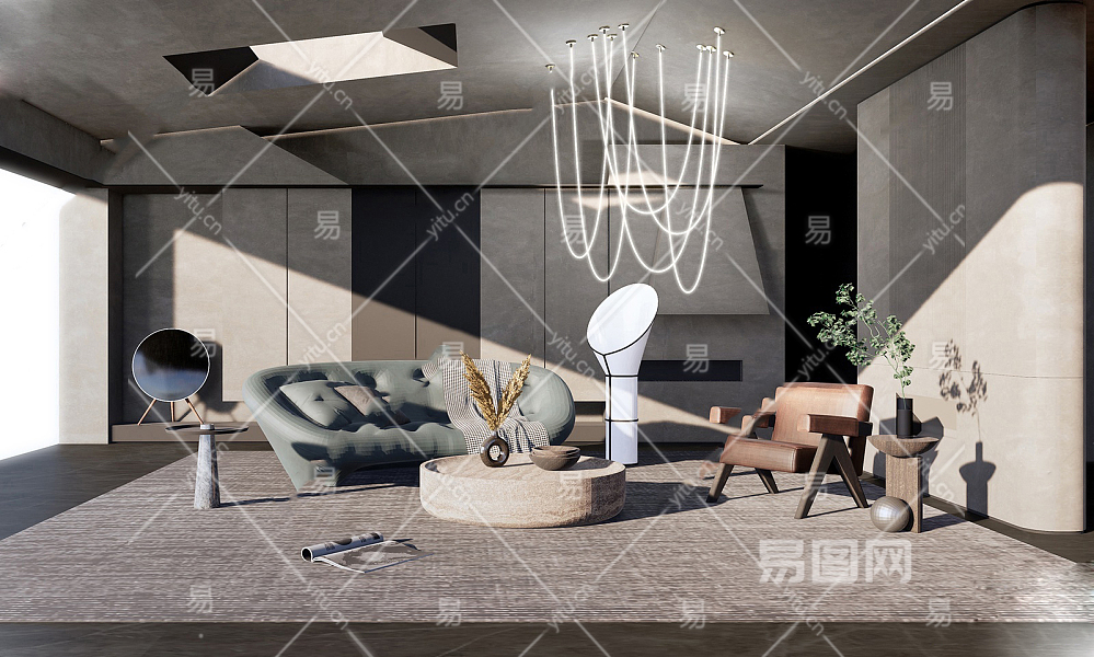 现代风格家居客厅 吊灯 沙发 椅子 茶几 植物