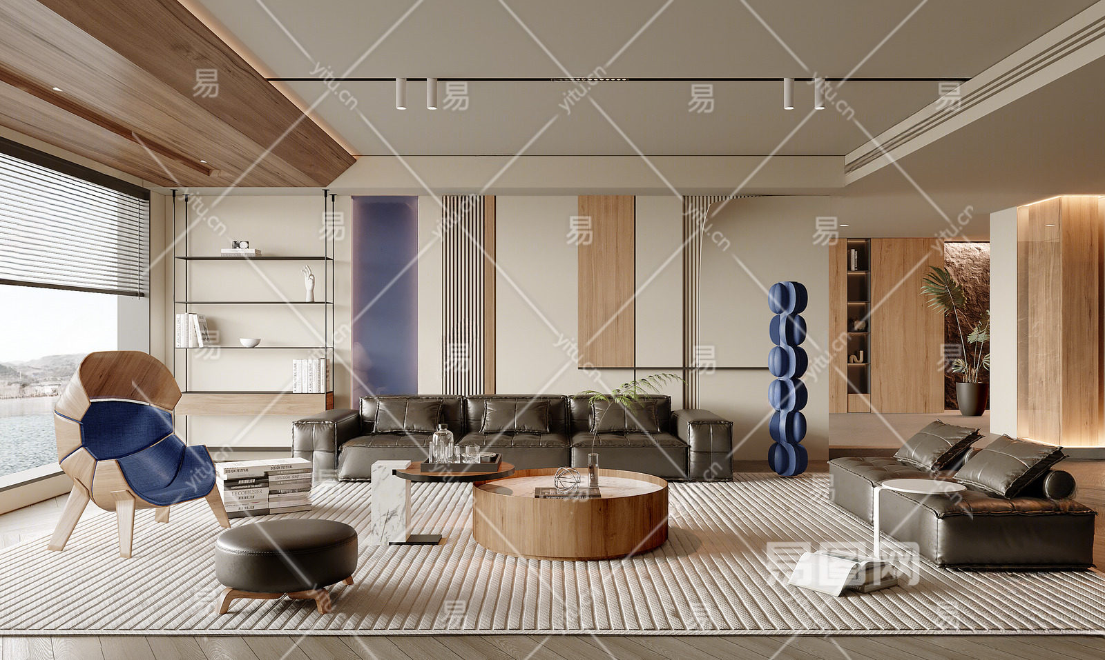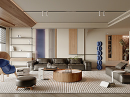 现代奶油风家居客厅 奶油风 沙发 沙发组合 茶几 置物架 摆件 绿植 书本