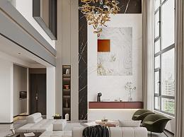 现代跃层别墅客厅组合 跃层客厅 吊灯 楼梯 沙发茶几 餐桌椅 沙发背景