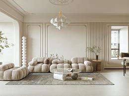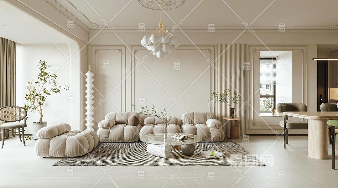 法式客餐厅 客餐厅 沙发茶几组合 多人沙发 面包沙发 吊灯
