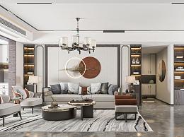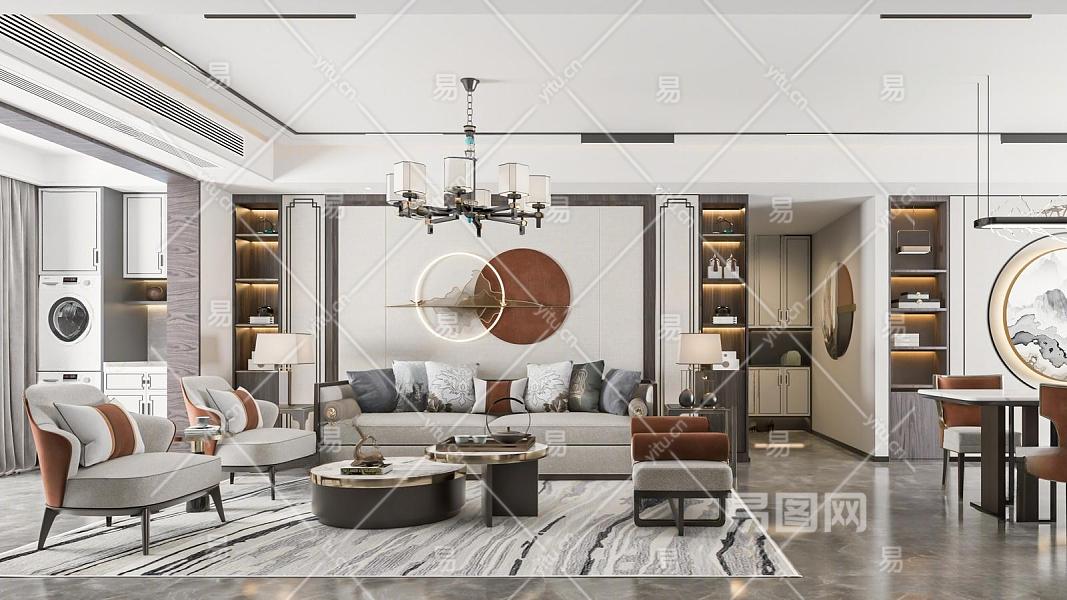 新中式客餐厅 客厅沙发茶几 电视背景墙 餐厅 单椅 餐桌椅 吊灯