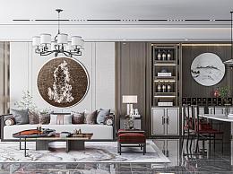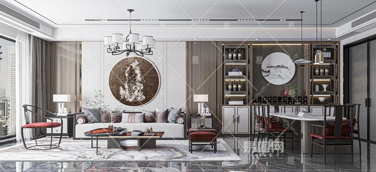 新中式客餐厅 沙发茶几组合 沙发背景墙 餐厅 西餐台 单椅 餐桌椅 吊灯