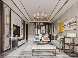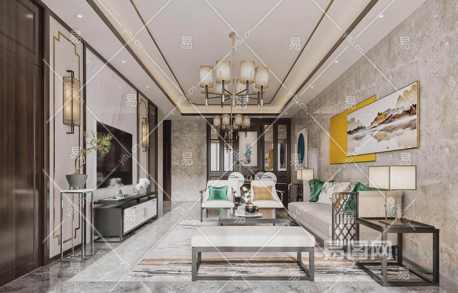 新中式家居客餐厅 沙发 茶几 电视柜 酒柜 餐桌椅 灯饰