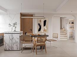 现代原木奶油风客餐厅 开放式厨房餐厅岛台 沙发茶几餐桌椅岛台操作台壁炉