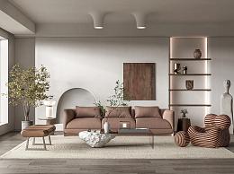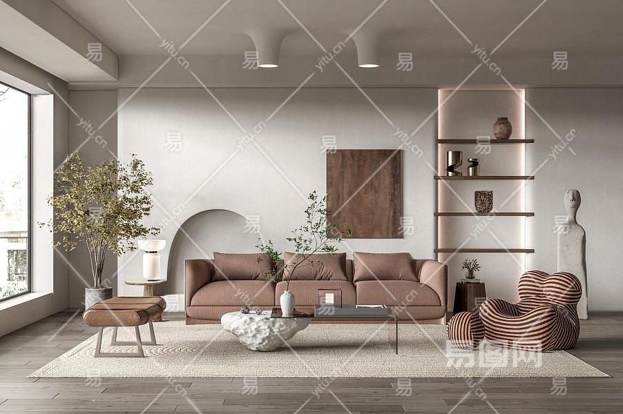 侘寂客厅 沙发茶几组合 单人沙发 沙发凳 雕塑摆件 绿植盆栽