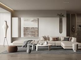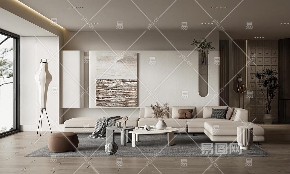 侘寂风客厅 沙发茶几组合 多人沙发 落地灯 雕塑摆件 绿植盆栽