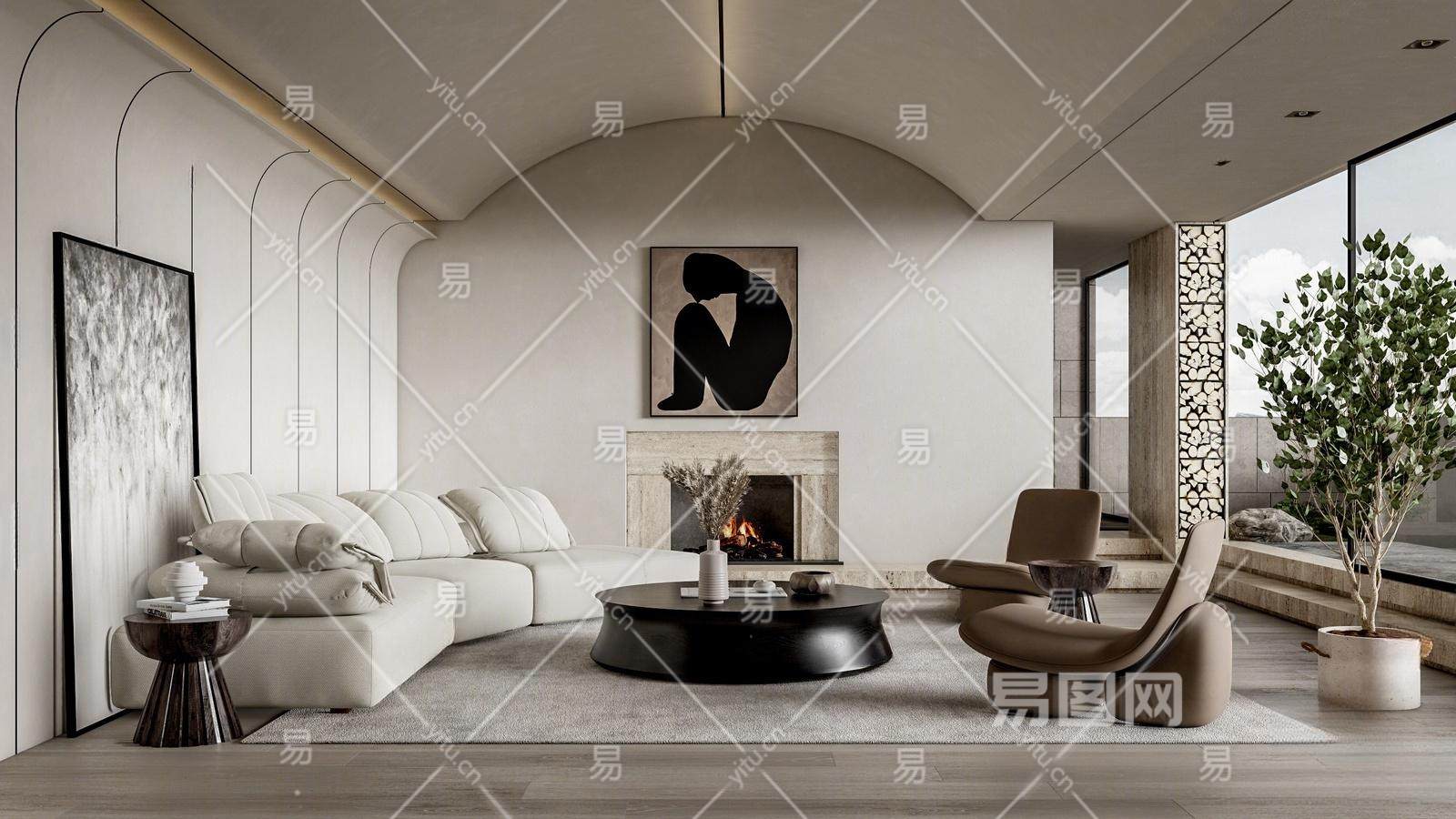侘寂风客厅 沙发茶几组合 装饰画 休闲椅 盆栽