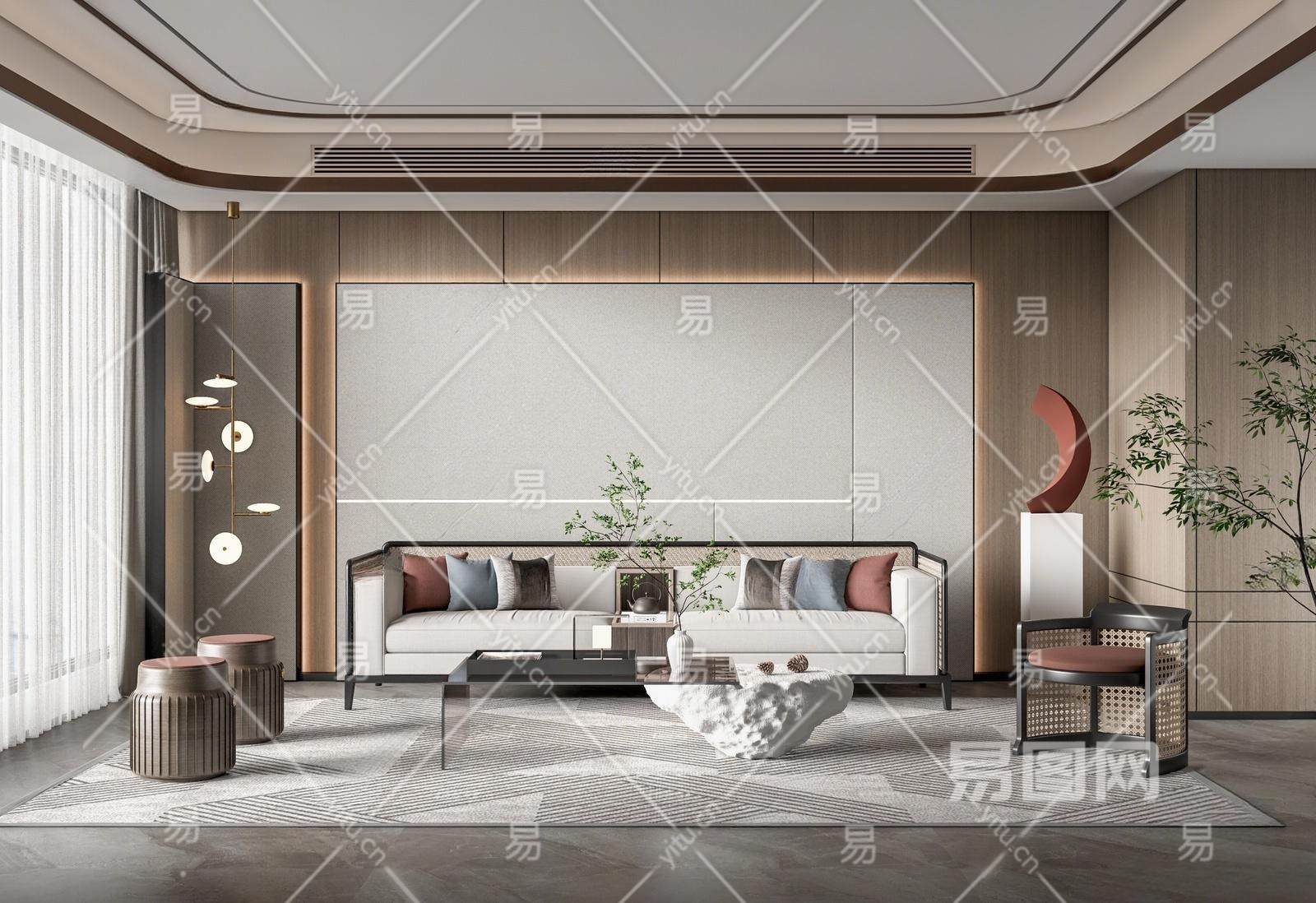 新中式客厅 藤编沙发茶几组合 吊灯 休闲椅 多人沙发 沙发凳 雕塑