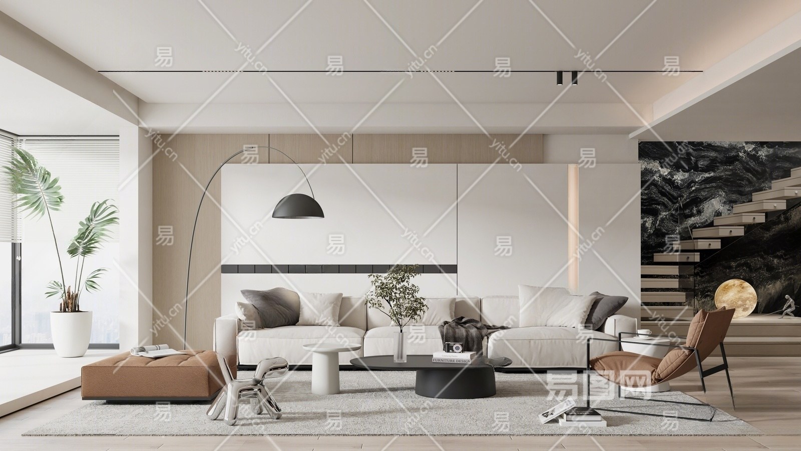 现代别墅客厅 多人沙发 休闲椅 植物 落地灯 楼梯间