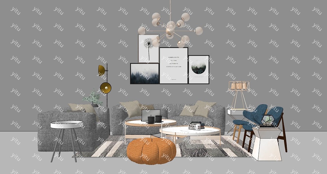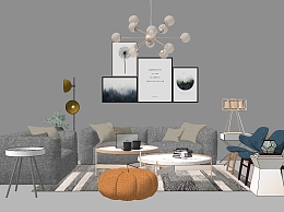 北欧风格客厅沙发组合su模型,客厅skb文件下载