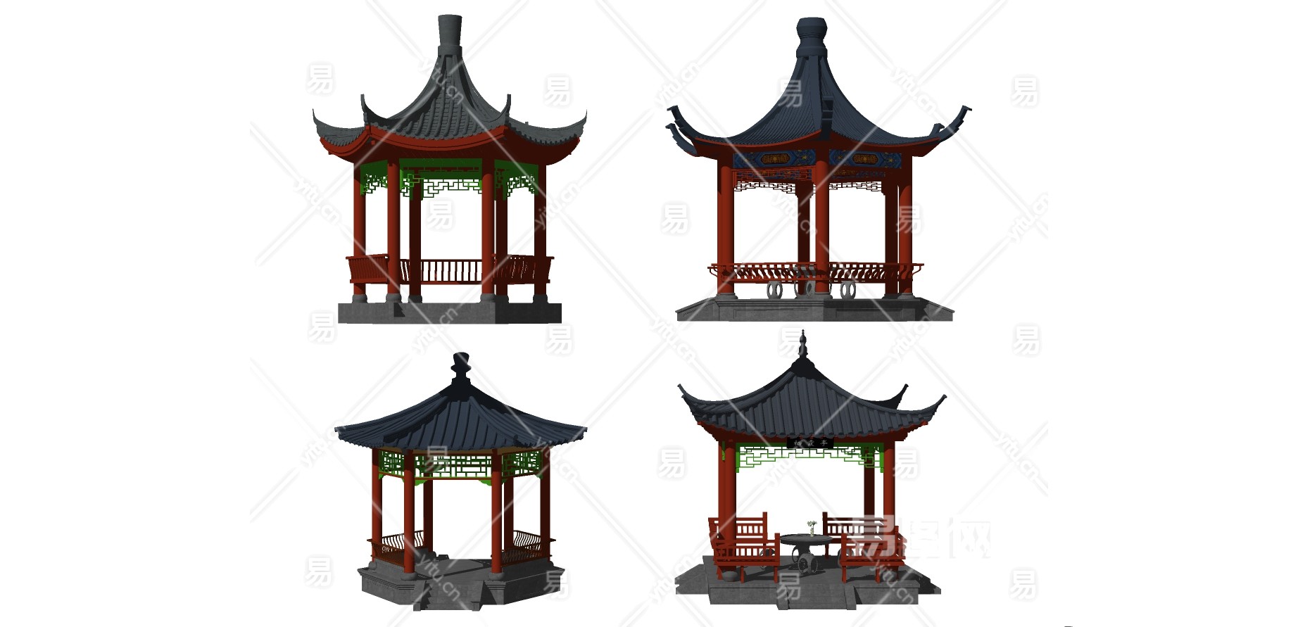 中式古建亭子凉亭,六角凉亭su草图模型下载