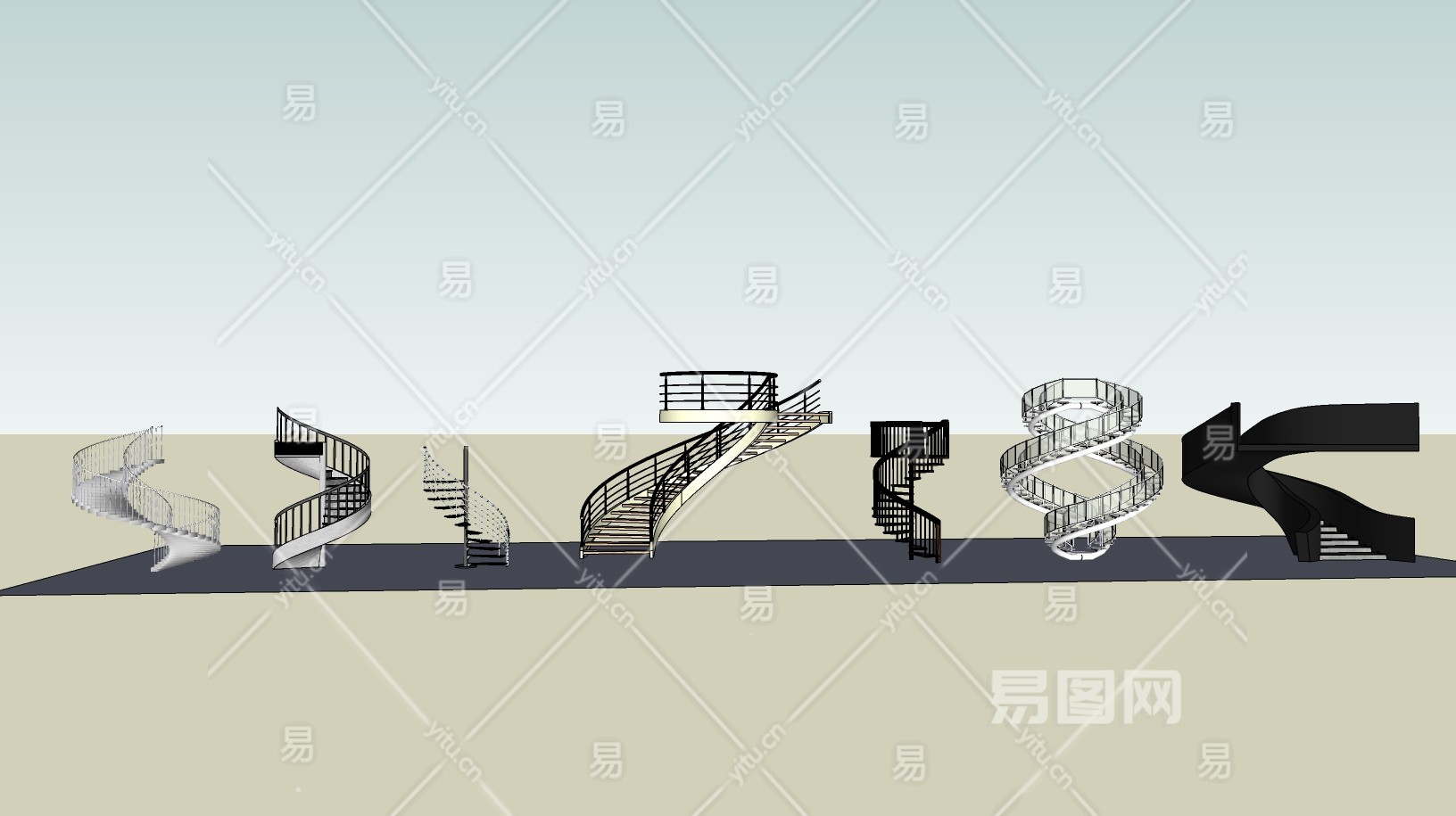 21现代旋转楼梯组合 工业风格钢楼梯 铁艺楼梯 栏杆 扶手 loft风钢板楼梯su草图模型下载