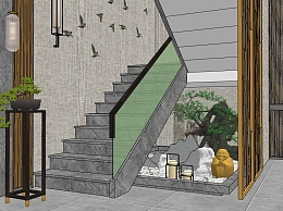 37新中式楼梯间干景 转角楼梯间景观 别墅楼梯 禅意庭院景观小品su草图模型下载