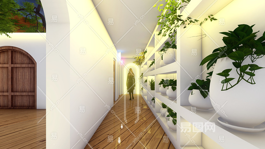 现代餐馆吧台区 彩色发光夜景树 厕所入口