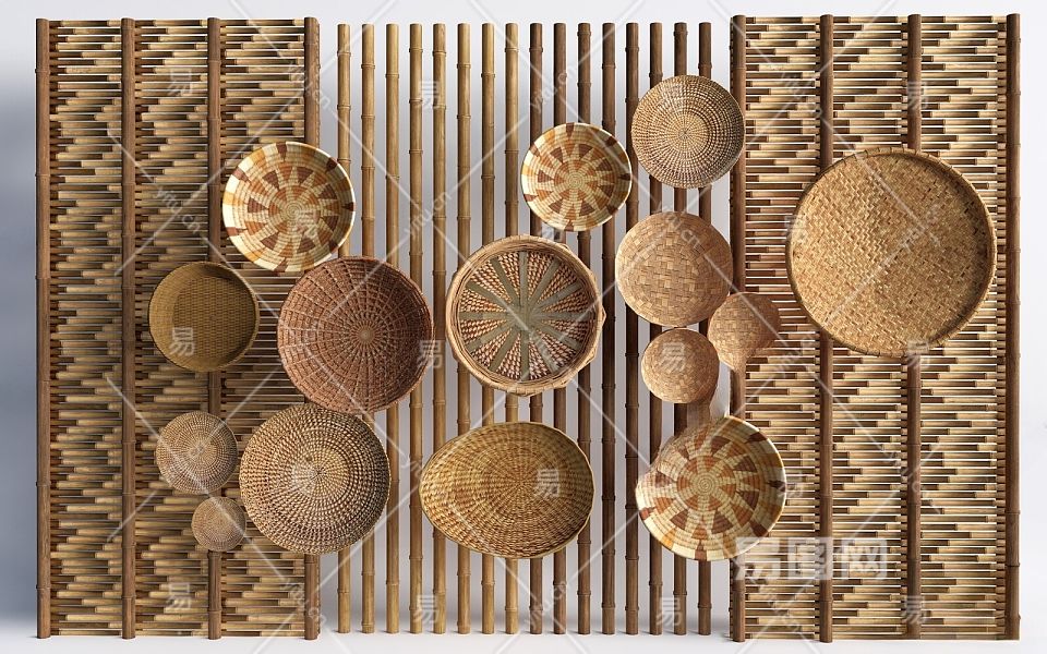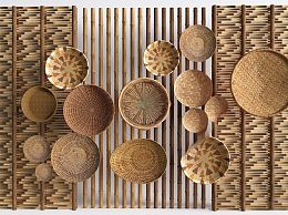 现代竹编背景墙 竹编展示墙 竹编装饰墙 簸箕 竹编小品 竹筐