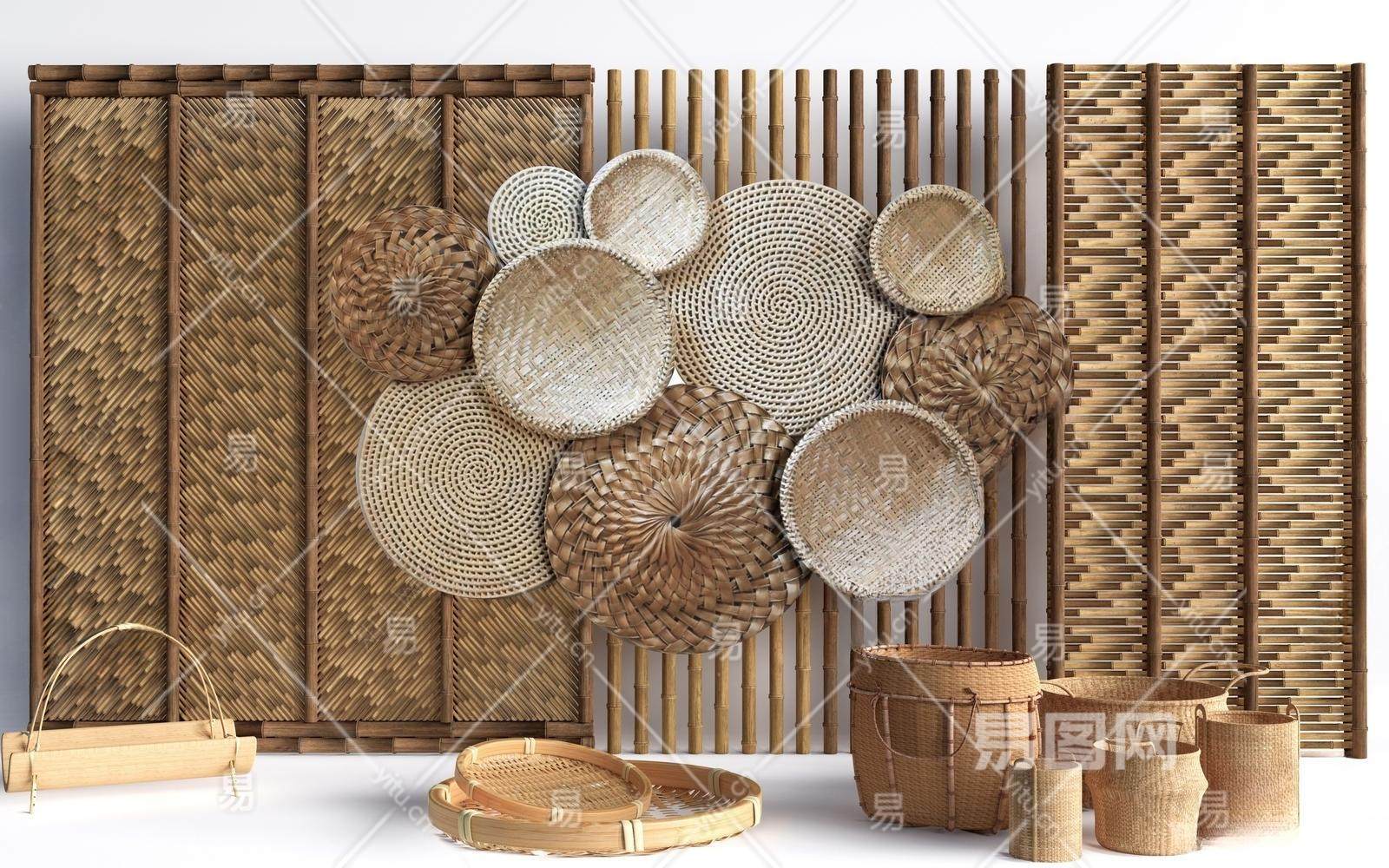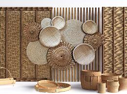 现代竹编背景墙 竹编展示墙 竹编装饰墙 簸箕 竹编小品 竹筐