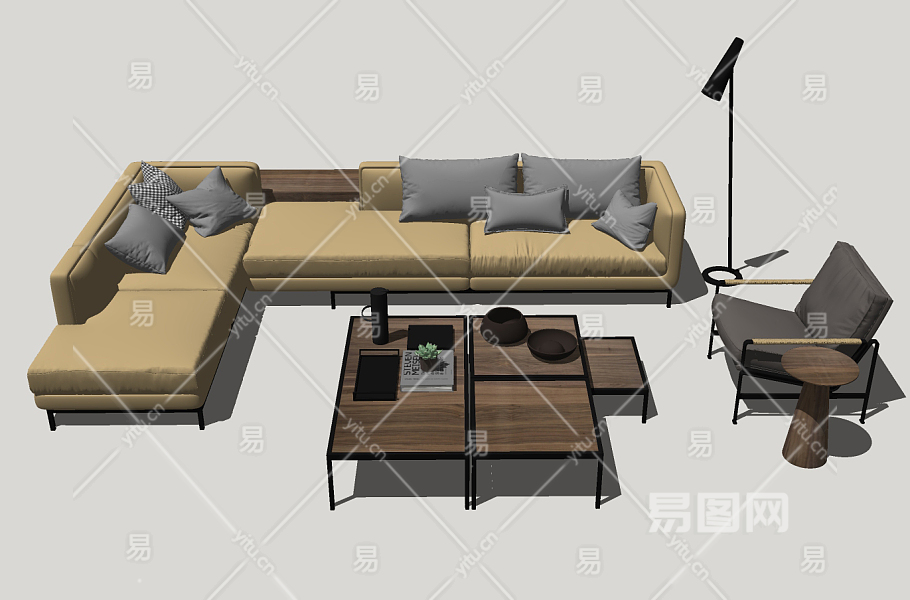 35现代转角组合沙发,茶几,落地灯,单椅su草图模型下载