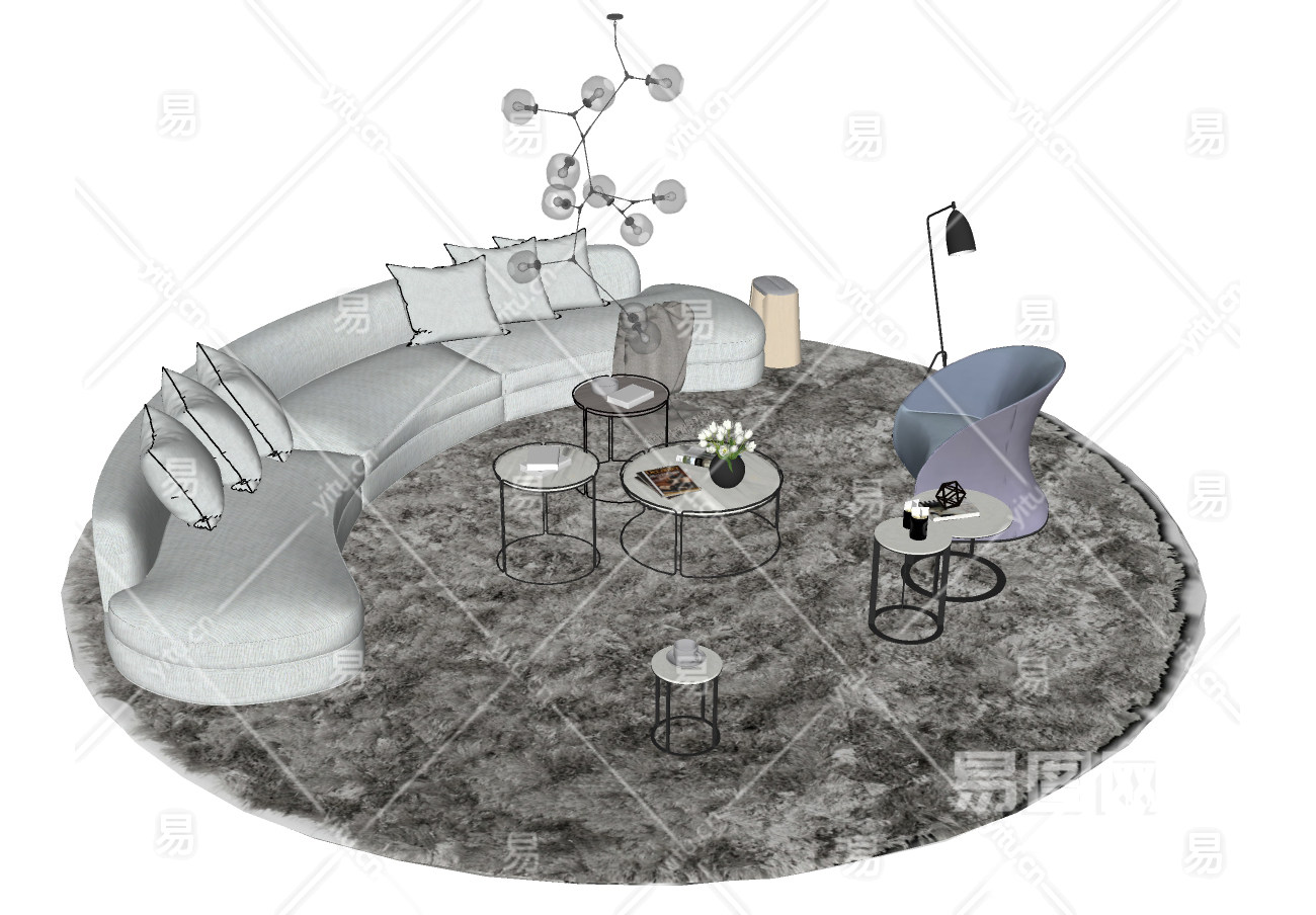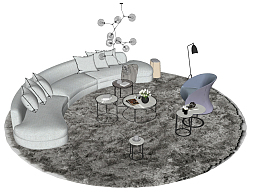 144现代布艺弧形沙发组合异形沙发,公共沙发组合,吊灯,茶几,休闲单人椅su草图模型下载