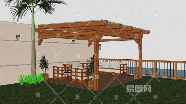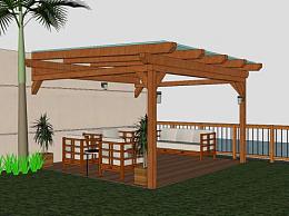 别墅区藤架花架玻璃隔板下的沙发茶几SU模型下载_sketchup草图大师SKP模型