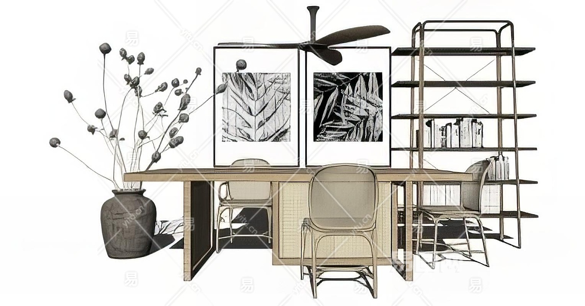 新中式东南亚度假风 书房 树桌椅 户外藤椅 花瓶风扇吊灯