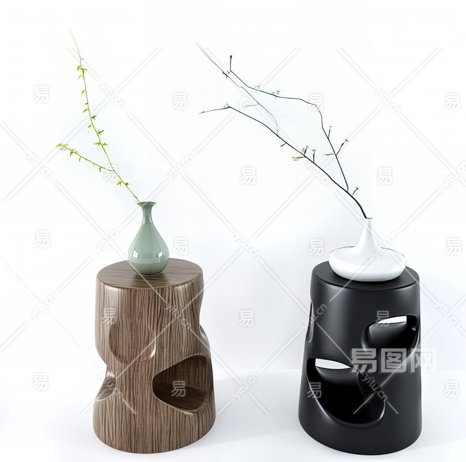 新中式圆形边几木墩子花瓶 植物 摆件