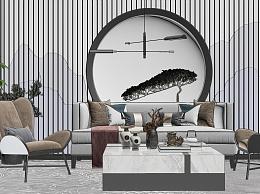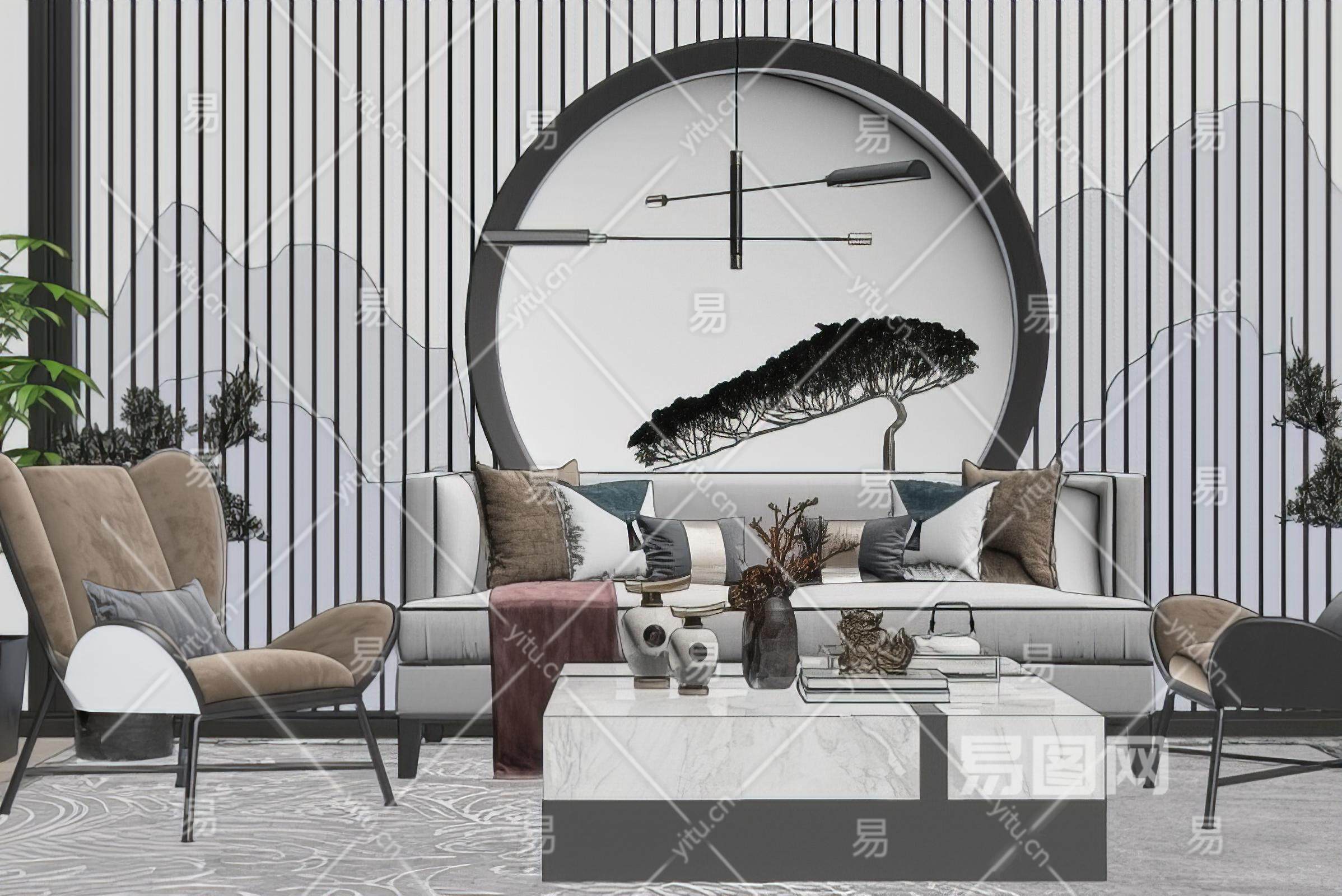 新中式沙发茶几组合 山脉山形格栅 背景墙